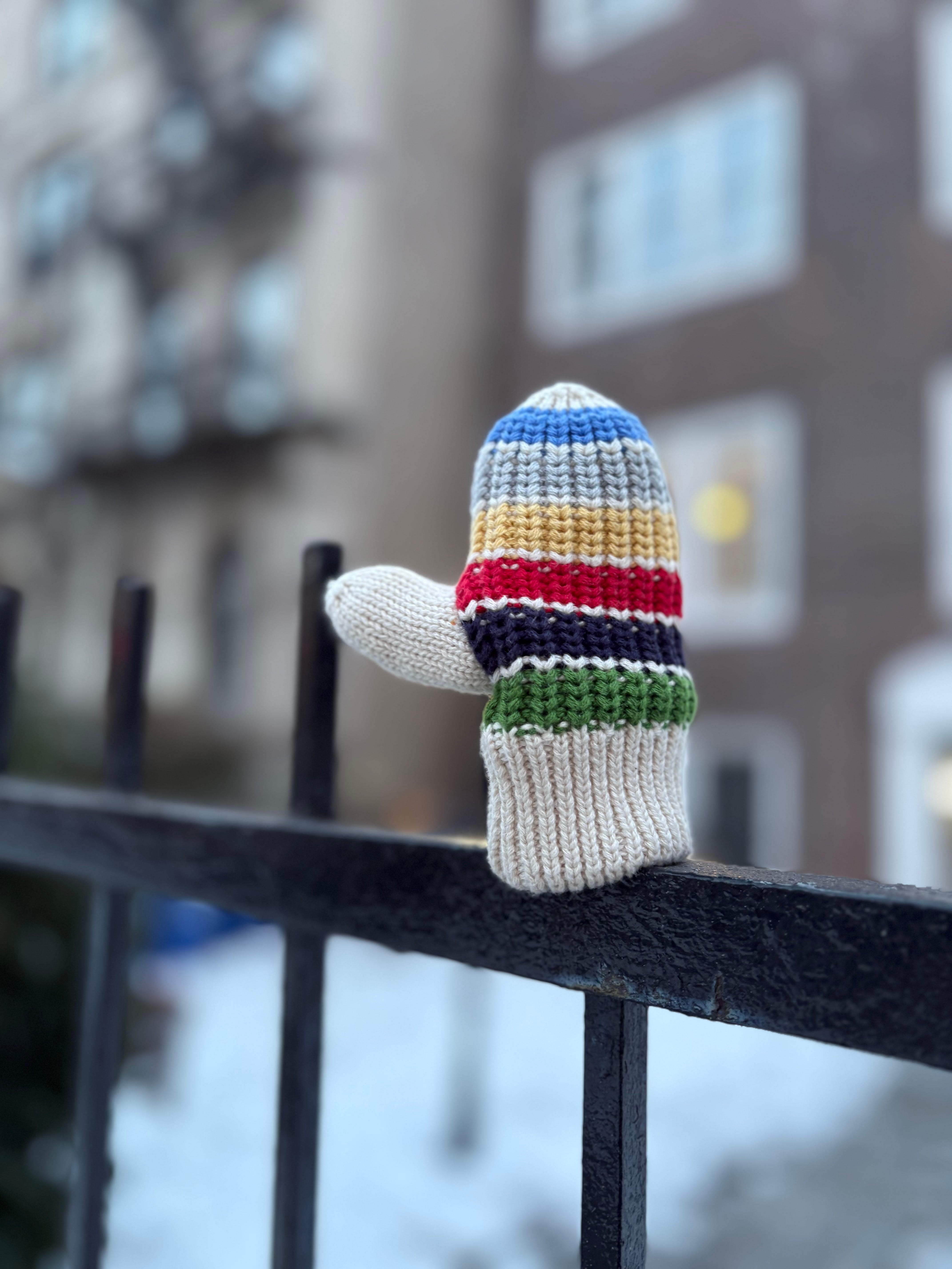 Who could be sad about losing this mitten? It’s so joyful! Maybe it wasn’t lost at all. Maybe it was left as a gift, a child’s wave for everyone braving the elements for a walk.